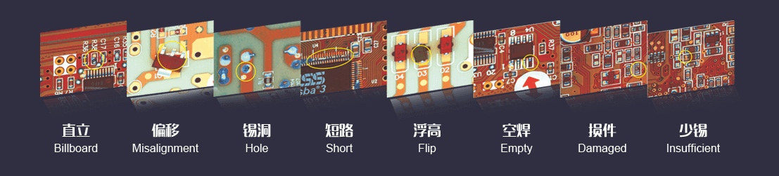 檢測覆蓋類型偏移、少錫、短路、污染、缺件、歪斜、立碑、側立、翻件、錯件、破損、浮高、極性、虛焊、
